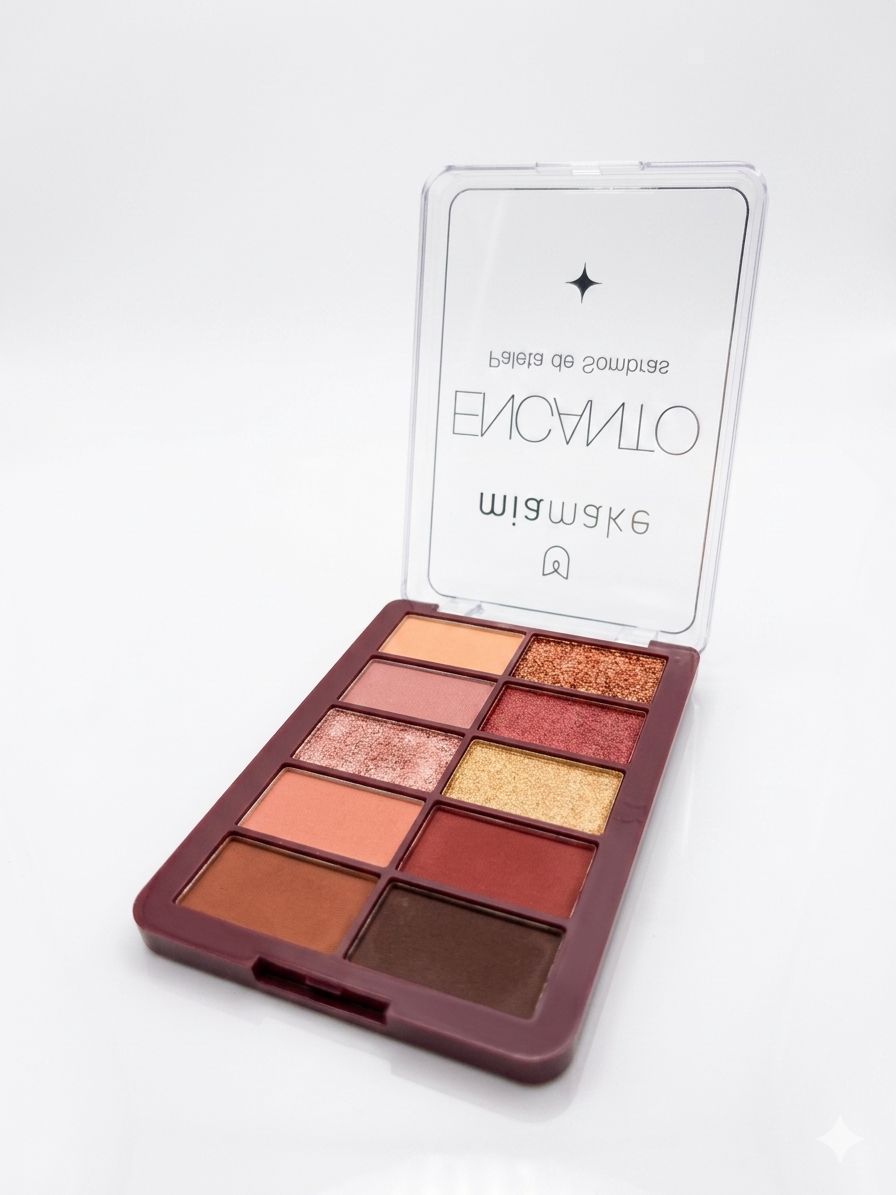 A paleta de sombras na imagem é a "Encanto" da marca Mia Make, que conta com 10 tons quentes e vibrantes, variando entre acabamentos mattes e cintilantes. É uma excelente opção para criar diversos looks, desde os mais sutis para o dia a dia até os mais ousados para a noite.